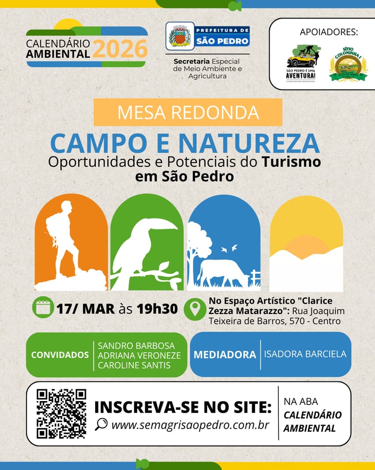 A mesa-redonda promoverá um diálogo prático sobre o Turismo Rural e de Natureza em São Pedro. Serão debatidos o cenário atual, os desafios, as tendências e as oportunidades para fortalecer o turismo sustentável no município.